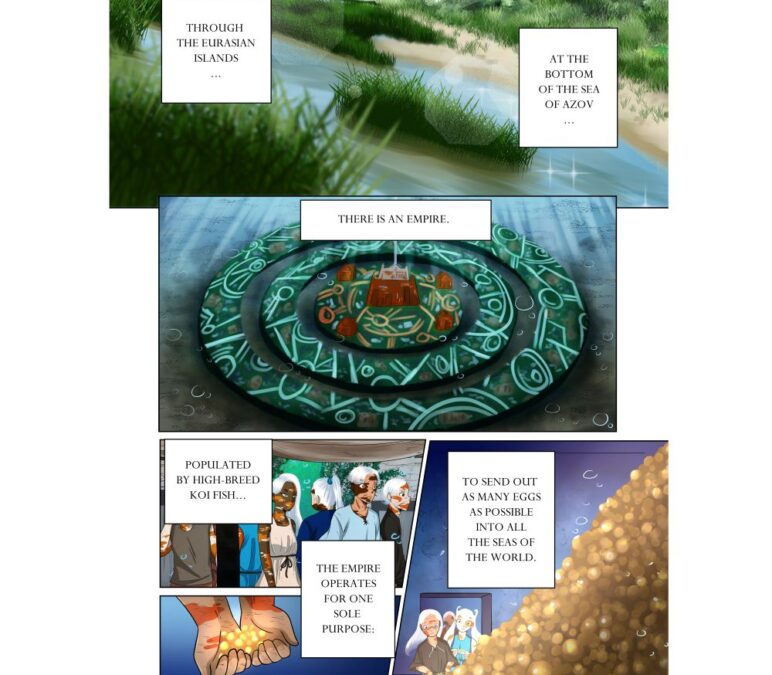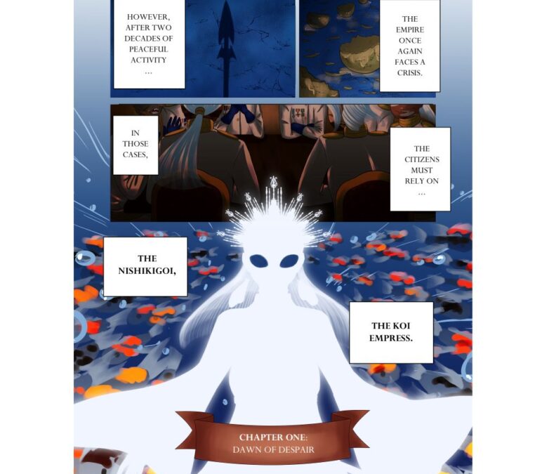 This comic illustrates the first pages of the story “Nishikigoi – The Koi Empress”. The colours were carefully selected to create harmony on the pages. The story evokes mystery and tension to intrigue the reader. Below are mockups of the printed product.